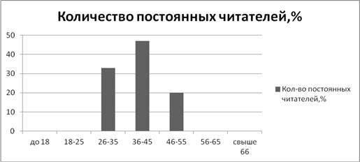 1. Постоянными читателями "Вечерки" являются 21 человек из числа опрошенных, среди них 9 читают ее каждую неделю. Постоянными читателями являются люди в возрасте от 36 и более лет (рисунок 1).