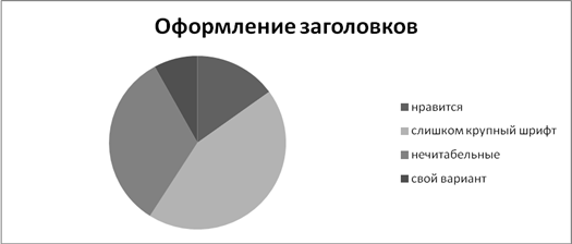 5.7 человек ответили, что им нравится оформление заголовков в "Вечерке", 22 человека считают, что шрифт заголовков слишком крупный, 16 человек - что их трудно читать, свои варианты предложили 5 человек, среди них: