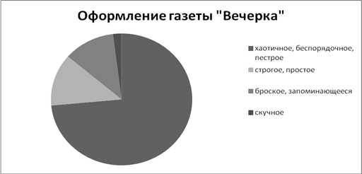 Итак, анализируя анкеты, можно сказать, что большинство респондентов заметило недостатки в дизайне "Вечерки" (мелкий шрифт, непривлекательное оформление заголовков, однообразие иллюстрационного оформления). Их отношение к дизайну газеты отрицательное (73%), они считают его "хаотичным, беспорядочным, пестрым" (75%).