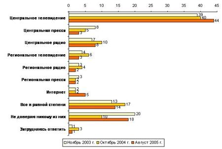 В ходе опроса по 3% россиян сказали, что доверяют региональному телевидению и центральной прессе, по 2% - региональному радио и региональной прессе. 14% респондентов ответили, что доверяют всем СМИ в равной степени. Вместе с тем исследование показало, что 18% россиян не доверяют ни одному средству массовой информации. Несколько чаще, чем в среднем по выборке о своем недоверии СМИ говорили жители мегаполисов (21%), пенсионеры (21%) и россияне с начальным уровнем образования (24%).