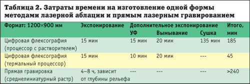 Изготовление цифровых печатных форм уже заняло прочные позиции во флексографской печати. Наравне с прямым гравированием, при котором с помощью высокомощного лазерного луча идет непосредственное формирование трехмерной структуры печатной формы, сегодня все шире применяется лазерная аблация, или так называемая цифровая флексография. Это довольно новая технология, при которой изображение с помощью лазера записывается на черном масочном слое фотополимерной пластины. Затем пластина подвергается обработке для формирования трехмерных печатных элементов, как обычная аналоговая пластина.