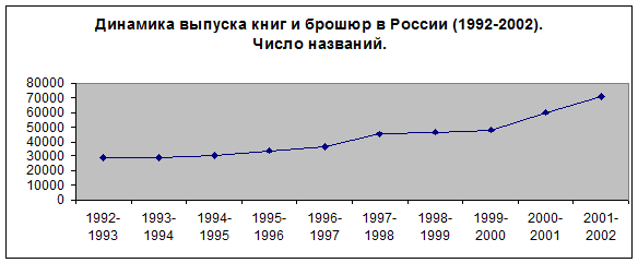 Динамика развития издательской индустрии за несколько лет действия закона о государственной поддержке СМИ и книгоиздания была чрезвычайно высокой. В 1995-1996 годах ежегодный прирост числа названий составлял более трех тысяч, а в 1997 году их было выпущено почти на десять тысяч больше, чем за предыдущий год (см. на диаграмму на рисунке 1 ).