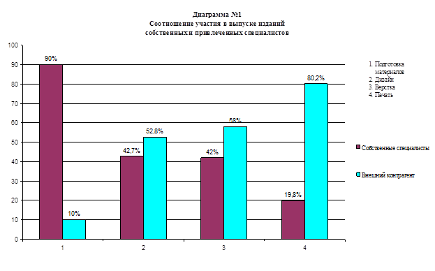 Дизайном и версткой примерно в равных долях занимаются собственные специалисты (47,2% и 42%) и внешние агенты (52,8% и 58%). Печатаются же издания чаще всего «на стороне» (80,2%), только в 19,8% случаев за дело берется собственная типография (диаграмма №1).