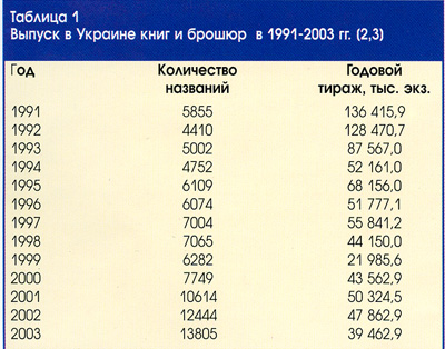 Книгоиздательское дело не существует в вакууме, оно является неотъемлемой составной частью общественной структуры и экономики в целом, поэтому беды, проблемы и кризисные процессы в этой сфере определяют темп движения, уровень, качественные характеристики каждого коллектива издательства. Пик книжного производства в Украине приходился на 1988-1989 гг., когда ежегодно печаталось около 190,0 млн экз. книжной продукции. После этого выпуск книг постоянно снижался и в 1999 г. составил 21 985,6 тыс. экз., то есть сократился в 8,6 раза. Начиная с 2000 г., наблюдается рост книжного производства и в последующие 2001-2003 гг. наступает некоторая стабилизация книгоиздания по тиражам (при некотором росте количества названий).