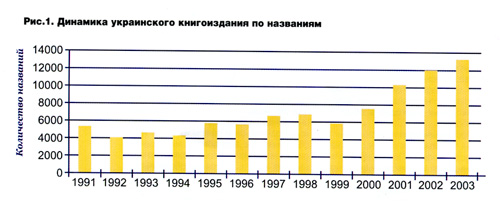 По сути именно количество новых названий книг является основным показателем активности издательства, характеризующим его мощность и творческий потенциал коллектива, и одновременно главным показателем мировой статистики печати. Как свидетельствует диаграмма (рис. 1), этот показатель вырос за годы, когда издатели Украины получили льготы и смогли привлечь ученых и профессионалов-полиграфистов для разработки и реализации навык издательских проектов. Без этих льгот издательства просто не имели бы средств для развития творческой инициативы.