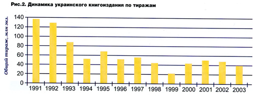 Существенное увеличение в Украине количества названий в 2001-2003 гг. дало возможность улучшить не только абсолютные, но и относительные пораметры издательского дела. Так, количество изданий в расчете на 1 млн жителей (показатель, который характеризует степень информационного обеспечения населения) возросло до 290 названий.