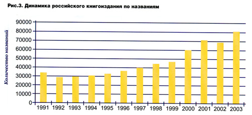 Тенденция к увеличению количества книг по названиям вселяет определенный оптимизм относительно быстрого выхода издательской сферы из кризисного состояния, т. к. этот показатель характеризует не только уровень развития книгоиздания, но и дает оценку общекультурной ситуации в стране, состояния науки, образования, интеллекта нации и других сфер функционирования общества в современных условиях. Этот показатель имеет еще одну особенность, связанную со спецификой издательского производства. Эта особенность делает данные о количестве названий универсальным мировым показателем, который определяет объем и эффективность книжного производства в реализации общего производственного проекта, содержащего новые творческие замыслы, новую производственно-экономическую реальность и новый маркетинг.