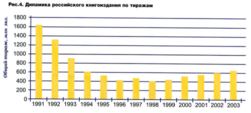 Динамика украинского книгоиздания по тиражам представлена на рис. 2. Как известно, все познается в сравнении, и если проанализировать состояние книгоиздательского дело в Российской Федерации (рис. 3 и 4), то можно увидеть, что аналогичная ситуация складывалась и в России в 1995-1996 гг., когда российские издатели начали работать на льготных условиях и осуществлять структурную перестройку издательского дела, адаптировав его к новым рыночным условиям. В 1992 г. в России печаталось 28,7 тыс названий книг (меньше дореволюционного уровня). Но уже в 1997 г. (через два года после принятия Государственной Думой льготного законодательство в сфере книгоиздания) в Российской Федерации печаталось 45 тыс. названий, а их количество в 2003 г. не только превысило максимум российского издания книг советского периода, а примерно соответствует общесоюзному количеству книг 1980-х годов. Это- наилучший показатель российского книгоиздания после распада СССР [2, 3).
