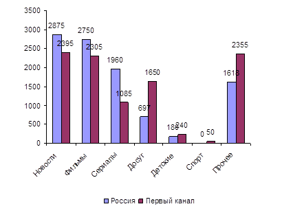 Из таблицы видно, что доля новостных передач «России» больше аналогичной доли «Первого канала» на 5%. Похожие цифры с фильмами и сериалами. Объем развлекательных передач на «Первом канале» выше аналогичного объема на телеканале «Россия» почти на 10%. Детских передач также больше, однако речь идет о десятых долях процента. Спортивных передач на «России» нет вообще, а на «Первом канале» это нерегулярные включения трансляций соревнований, которые иногда бывают и на второй кнопке. Рекламы, заставок и анонсов на первом канале согласно таблице больше, однако мы уже обратили внимание на тот факт, что «Россия» включает во время показа передач и фильмов рекламные паузы большей продолжительности, поэтому в конечном итоге показатели примерно одинаковы.