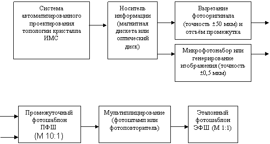 На рисунке 2 представлена последовательность операций изготовления фотошаблонов различными методами. Наиболее простым и сравнительно дешёвым способом является оптико-механический. Способ включает в себя такие операции как вычерчивание оригинала, его репродуцирование и промежуточный отъем, мультиплицирование с одновременным уменьшением размера модуля до масштаба 1:1, изготовление рабочих копий фотошаблона. Недостатком этого способа является его многоэтапность, что определяет высокую трудоёмкость и большую продолжительность процесса изготовления. Поэтому оптико-механический способ применяют при изготовлении плат ГИС и ИМС малой или средней степени интеграции.