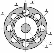 Магнетрон рис. 17 состоит из анодного блока 1, который представляет собой, металлический толстостенный цилиндр с прорезанными в стенках полостями, выполняющих роль объёмных резонаторов 2. Резонаторы образуют кольцевую колебательную систему. Соосно анодному блоку закрепляется цилиндрический катод 3. Внутри катода закреплён подогреватель. Магнитное поле, параллельное оси прибора, создается внешними электромагнитом. Для вывода СВЧ энергии 5 используется, проволочная петля 6, закреплённая в отверстие из резонатора наружу цилиндра. Так как в магнетроне с одинаковыми резонаторами разность частот получается недостаточной, её увеличивают введением связок 4 в виде