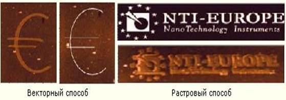 Существует два способа проведения нанолитографии – векторный и растровый. Векторный – более быстрый способ, но он не позволяет изменять силу воздействия. Растровый же – более медленный, но можно варьировать силу воздействия. На рисунке представлен сканер, который может осуществлять нанолитографические операции. Процесс считывания занимает значительное время при хорошем качестве сканирования. Процесс рисования изображения на поверхности является преимуществом данного сканера. При выполнении процесса записи головка быстро приходит в негодное состояние.