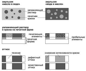 Рисунок 6. Взаимодействие увлажняющего раствора с краской и влияние эмульгирования на качество оттиска