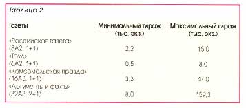 В 2002 г. по-прежнему происходили широкие изменения разовых тиражей газет, причем, как и в 2001 г., преобладала тенденция уменьшения тиражей газет. Таким образом, можно констатировать, что позитивная тенденция роста тиражей, проявившаяся ранее, в 2002 г. так и не возобновилась; большинство предприятий увеличили тиражи только по «толстушкам» «Российской газеты» и «Комсомольской правды». Информация о разбросе средних разовых тиражей ежедневных номеров центральных газет по состоянию на 01.01.2003 г. представлена в таблице 2.