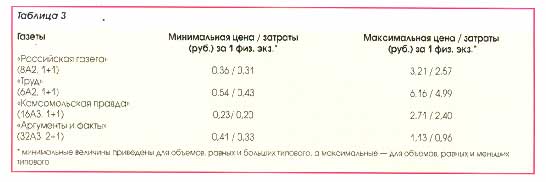 Минимальные и максимальные цены и затраты на полиграфическое исполнение ежедневных номеров центральных газет по состоянию на 01.01.2003 г. представлены в таблице 3.