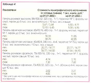 Проведенный анализ показал, что в 2002 г. более 80 % предприятий базы исследования увеличили расценки на полиграфическое исполнение книг. Разброс стоимости полиграфического исполнения 1 экз. книги в 2002 г. в разрезе некоторых типовых вариантов технических параметров представлен в таблице 4.