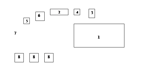 1 – четырехкрасочная офсетная листовая машина среднего формата «Планета-Вариант» (Р-44); 2 – стол печатника; 3 – шкаф для инструментов; 5 – контейнер; 6 – устройство для предварительной зарядки самонаклада; 7 – стойка для пластин; 8 – платформа.