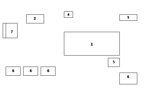 1 – двухкрасочная офсетная листовая машина большого формата РО-6; 2 – стол печатника; 3 – шкаф для материалов; 4 – шкаф для инструментов; 5 – устройство для предварительной зарядки самонаклада; 6 – платформа; 7 – стойка для пластин.