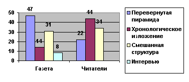 Газеты подают подавляющую часть своих новостей, пользуясь нарративной структурой перевернутой пирамиды; читатели в основном выбирают хронологически выстроенное повествование. Читатели ближе к текущим критериям качества, чем газеты, которые все еще держатся за технологически устаревшую нарративную структуру.