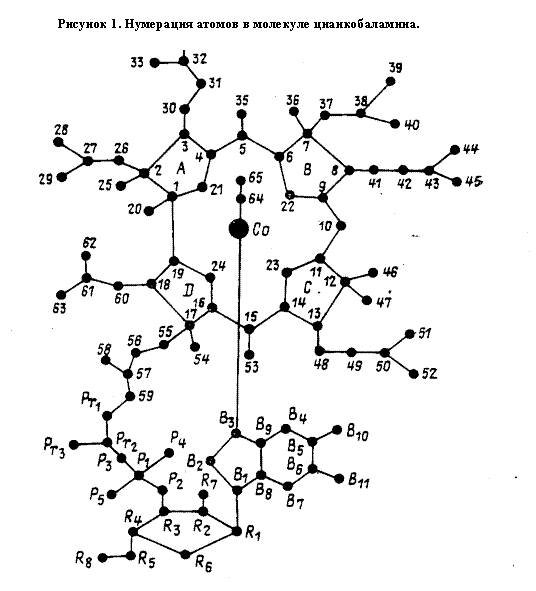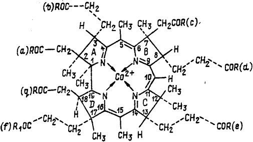 Цианкобаламин относится к классу корриноидов - производных коррина, структура которого родственна порфирину. Однако, наряду с близостью их структур, имеются два важных химических различия между этими макроциклами. В то время как порфирин содержит систему из 12 сопряженных двойных связей, коррин состоит из частично восстановленных пиррольных (пирролиновых) гетероциклов. Корриновое кольцо содержит 6 двойных связей, входящих в состав линейной сопряженной системы, включающей 12 из 15 атомов, составляющих внутренний контур макроцикла. Корриновое кольцо сужено по сравнению с порфириновым. Если в порфирине каждая пара пиррольных колец отделена метиновыми мостиками, то в коррине кольца А и D соединены непосредственно связью между α-положениями. Поэтому внутренний контур корринового макроцикла содержит на один атом углерода меньше, чем порфириновый.