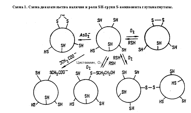 Компонент S после очистки, как оказалось, обладал намного меньшей мол. массой 17000 и, по-видимому, содержал важные для проявления ферментативной активности SH- группы. Титрование S-белка сульфгидрильными реагентами показало, что на 1 моль белка приходится пять SH-групп. Примечательной особенностью компонента была его способность к димеризации в присутствии О2. Расщепление димера осуществлялось обработкой последнего каким-либо RSH-соединением. Это свидетельствовало об образовании межмолекулярного дисульфидного мостика. Инактивация S-белка с помощью AsO2- доказывала наличие в активном центре по крайней мере одной из двух вицинальных тиольных групп. Превращение SH-групп S-белка представлены на схеме 3.