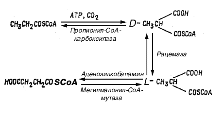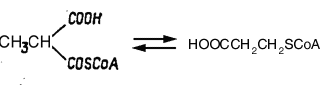 Другой аденозилкобаламин-зависимый фермент, осуществляющий перегруппировку углеродного скелета метилмалонил-СоА в сукцинил-СоА был также сначала выделен из микроорганизмов, а затем из тканей млекопитающих. Оказалось, что этот кобаламин-зависимый фермент выполняет метаболически важную роль на пути превращения пропионил-СоА в сукцинил-СоА. Схема этого участка метаболизма включает 3 фермента: биотин-зависимую карбоксилазу, рацемазу, превращающую D-метилмалонил-СоА в L-изомер и рассматриваемую кобаламин-мутазу. После очистки метилмалонил-СоА-мутазы оказалось, что это субъединичный фермент с мол. массой 124000, расщепляющийся на два компонента с мол. массой 61 000 и 63000. Выделенная из печени овцы метилмалонил-СоА-мутаза представляет собой окрашеный в оранжевый цвет белок с мол. массой 165000. Фермент связывал 1 моль аденозилкобаламин на 75000.