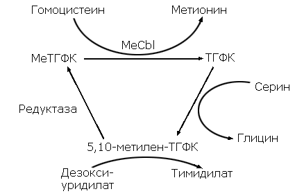 Существует два типа ферментов, осуществляющих синтез метионина – первый, независимый от кобаламинов, может использовать в качестве донора метильной группы только триглутаматную форму СН3-ТГФК. Второй тип ферментов, зависимый от кобаламиновых кофакторов, может использовать как моно-, так и триглутаматную форму СН3-ТГФК. Для активации ферментов второго типа, кроме того, требуется S-аденозилметионин (S-AdoMet). Последний необходим для первоначального метилирования кобаламина.