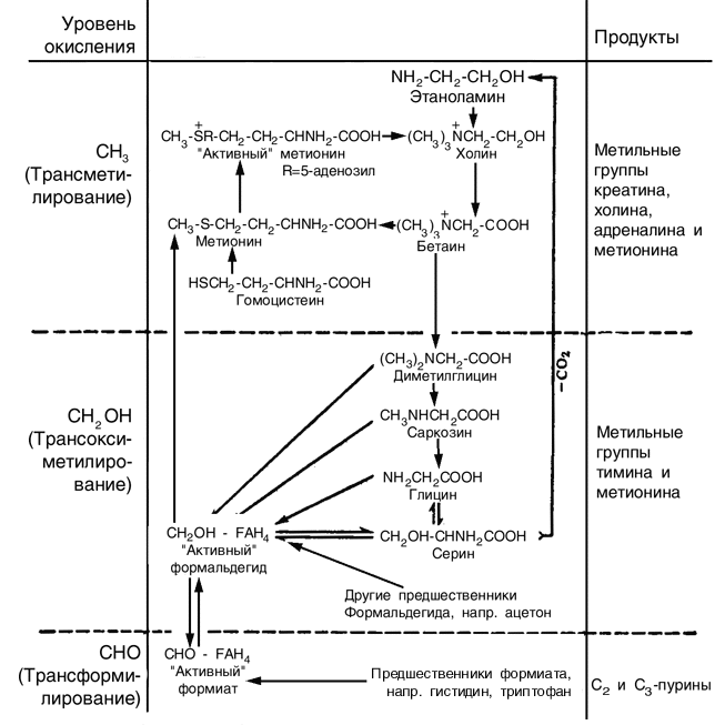 характерного для авитаминозных животных (метод "парного кормления"). Подтверждение данных для поросят и цыплят в опытах с 14С-формиатом и 14С-серином получили Джонсон и сотр. Однако при использовании меченого формальдегида результат оказался неожиданным: интенсивность включения метки в метильные группы метионина и холина у цыплят с недостаточностью витамина B12 оказалась значительно повышенной. Есть основательные данные в пользу того, что новообразованные метильные группы появляются в метионине, но потом в результате трансметилирования они могут оказаться в холине или креатине. Эти выводы никто не оспаривал, но некоторые исследования позволяли предположить, что, кроме того, при недостаточности витамина B12 у крыс активность трансметилазы в печени понижена.