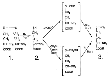 Было высказано предположение, что витамин B12 способен играть роль восстановителя, когда его трехвалентный кобальт восстановлен до двухвалентного состояния. Однако нужны сильные восстановители, чтобы вызвать эту реакцию, которая в присутствии атмосферного кислорода идет в обратном направлении. Предположение о том, что соединение с белком могло бы сдвинуть окислительно-восстановительный потенциал в область физиологических величин, не вполне убедительно, так как способность связывать белок после восстановления, возможно, утрачивается.