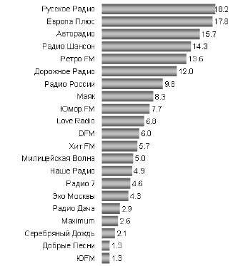 На втором месте (548 городов) – «музыка для взрослых», две наиболее крупные радиостанции, передающие музыку этого направления, – «Авторадио» и «Дорожное радио».