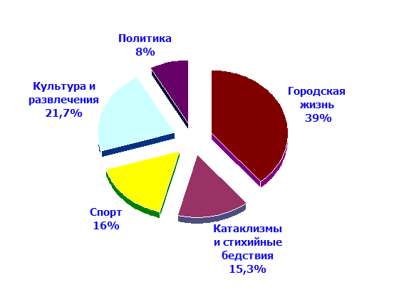 2. Качественно-количественная характеристика новостных выпусков по освещению текущих событий представлена на радиостанции следующим образом: городская жизнь - 39%, катаклизмы, стихийные бедствия - 17,3%, спорт - 16%, культура и развлечения - 21,7%, политика - 8%.