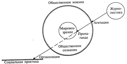 Пропаганда устремлена к тяжелому, инертному ядру — мировоззрению, которое включает в себя систему принципов, идеалов, убеждений, определяющих отношение к природе, обществу и человеку. Среди многочисленных версий происхождения слова «пропаганда» в его теперешнем значении есть и такая: первоначально его употребление было связано с работой садовников, укреплявших корни и побеги растений. Пропагандист как раз и озабочен тем, чтобы в сознании публики укреплялись определенные воззрения и представления о мире. Система базовых представлений человека и общества, нравственных ценностей и идеалов не меняется в одночасье, она, как правило, эволюционирует под влиянием длительного целенаправленного воздействия. Применительно к журналистике, с ее приверженностью скорее конкретным фактам, чем отвлеченным идеям, это верно вдвойне.