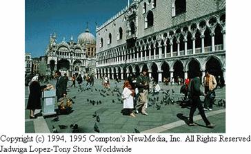 В центре города огромная площадь св. Марка. Ее окружают здания, в которых размещались когда-то правительственные учреждения Венецианской республики. Особенно прекрасны собор св. Марка и Дворец дожей — правителей республики. С древних времен Венеция славится производством художественного стекла и кружев. В наше время Венеция (точнее, ее пригороды Местре и Маргера) — важные порты.