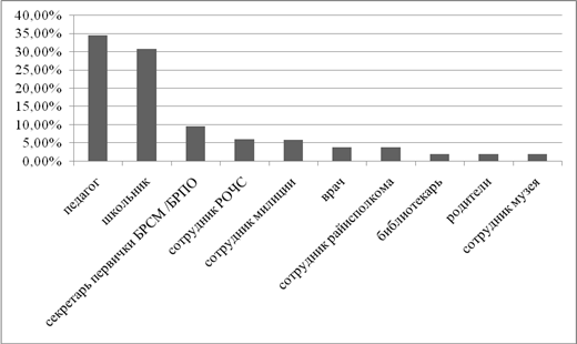 В подготовке номеров принимают участие представителями различных профессий и сфер занятости: педагоги, секретари первичных организаций Белорусского республиканского союза молодежи и Белорусской республиканской пионерской организации, сотрудники милиции и отдела по чрезвычайным ситуациям, врачи, сотрудники районного исполнительного комитета, библиотекари, родители, сотрудники музея (см. диаграмму 2). Из этого следует, что достаточно широкий круг специалистов занят в процессе воспитания и образования подрастающего поколения. Редакции газет привлекают также и своих юных читателей к журналистскому творчеству, предоставляя возможность рассказать об интересующих молодое поколение событиях и фактах: «Газета или Интернет?» [64], «Кем быть?» [67] и др.