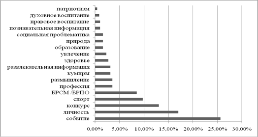 в) кружок: «У хакей гуляюць сапраўдныя мужчыны? А ў нас і дзяўчаты гуляюць у хакей!» [76], «Сорок ростков дивного “Кокоса”» [182] и др. Реже встречаются публикации со следующей тематикой: образование, природа, социальная проблематика, правовое воспитание, духовное воспитание, патриотизм. Количество подобных материалов колеблется от одного до четырех за исследуемый нами период.