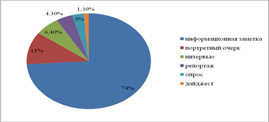 Жанровая палитра не так разнообразна, как тематическое поле (см. диаграмму 4). Преобладают информационные заметки, построенные по строгой модели: «кто? что? когда? где? почему?». Встречаются на газетной полосе портретные очерки, интервью, репортажи, социологические опросы, дайджесты новостей.