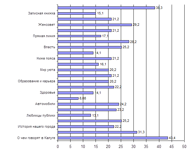 Глядя на рисунок 2 (см. стр. 20), видим, что наибольшее предпочтение читатели отдают предпочтение рубрике «О чем говорят в Калуге» (43,4% или 129 человек).