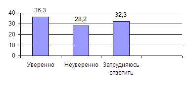 Из рисунка 3 (см. стр. 21) следует, что большинство респондентов 36,3% (108 человек) ответили, что уверенно ощущают себя в современном мире. Очень большое количество опрошенных 32,3% (96 человек) затруднились ответить на данный вопрос. Неуверенно ощущают себя в современном мире немалое количество респондентов – 28,2% (84 человека). Имелись также собственные варианты ответов респондентов. 2,02% (6 человек) ответили что «средне», 0,33% (по одному человеку) – что «скорее неуверенно» и «Неуверенно, так как пока не нашла себя и то, что мне интересно».