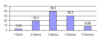 Рисунок 4 иллюстрирует, что на вопрос, «Как Вы оцениваете устроенность своей жизни по пятибалльной шкале», большинство опрошенных (39,3% или 117 человек) ответили, что на 3 балла. На 4 балла оценили ее 30,3% (90 человек). Считают, что жизнь устроена на 2 балла 19,1% (57 человек). На 5 баллов оценили устроенность своей жизни только 8,08% (24 человека). На 1 балл – 3,03% (9 человек).