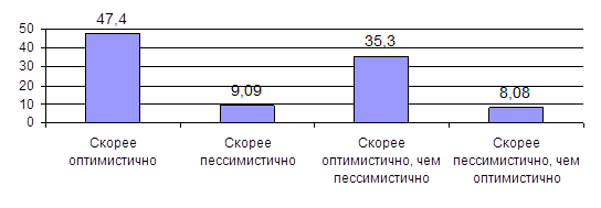 Как видно на рисунке 5 (см. стр. 22), наибольшее число респондентов оценивают своё будущее скорее оптимистично, чем пессимистично (35,3% или 105 человек). 47,4% (141 человек) ответили, что оценивают своё будущее оптимистично, 9,09% (27 человек) – пессимистично и 8,08% (24 человека) – скорее пессимистично, чем оптимистично.