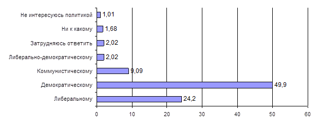 Как видно на представленном ниже рисунке 8, к демократическому политическому течению причисляют себя большинство опрошенных – 49,9% (147 человек), к либеральному 24,2% (72 человека), к коммунистическому 9,09% (27 человек). Имелись и собственные варианты ответов респондентов: 2,02% (6 человек) затруднились ответить, 2,02% (6 человек) причислили себя к либерально-демократическому течению, 1,68% (5 человек) не отнесли себя ни к какому течению и 1,01% (3 человека) отметили, что вообще не интересуются политикой.