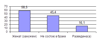 На рисунке 11 отображено семейное положение респондентов. Большинство респондентов (58,5% или 174 человек) состоят в браке, 45,4% (135 человек) не состоят в нем, и 16,1% (48 человек) состояли в браке ранее, но во время проведения исследования были разведены.