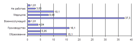 На рисунке 12 (см. стр. 26) видно, что большинство опрошенных (37,3% или 111 человек) работают в сфере услуг. 16,1% (48 человек) в сфере производства, 15,1% - в сфере образования. В сфере торговли трудятся 10,1% опрошенных (30 человек), в медицине – 8,08% (24 человека), в правоохранительной деятельности 5,05% (15 человек), в экономике – 4,04% (12 человек), не работают 3,03% (9 человек). Опрошенных пенсионеров и военнослужащих по 1,01% (по 3 человека).