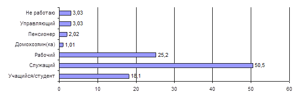 Как видно на рисунке 13, большинство опрошенных (50,5% или 150 человек) причислили себя к служащим. В два раза меньше (25,2% или 75 человек) – к рабочим. 18,1% (54 человека) учащихся/студентов приняли участие в нашем опросе, 3,03% ( по 9 человек) управляющих и безработных, 2,02% (6 человек) пенсионеров и 1,01% (3 человека) – домохозяек/домохозяинов.
