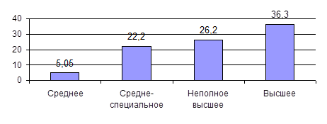 Большинство опрошенных 36,3% (108 человек) отметили, что имеют высшее образование. Неполное высшее – 26,2% (78 человек), 22,2% (66 человек) – среднее специальное и 5,05% (15 человек) – среднее образование. Данные отображены на рисунке 14.