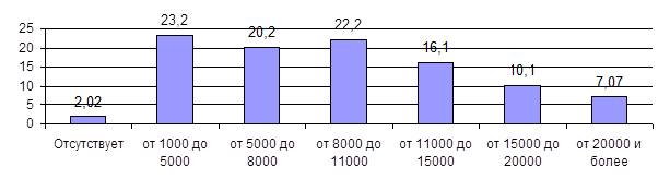 Рисунок 15 иллюстрирует, что большинство опрошенных (23,2% или 69 человек) отметили, что доход на одного члена их семьи составляет от 1000 до 5000 рублей. Чуть меньше (22,2% или 66 человек), что их доход на члена семьи составляет от 8000 до 11000. 20,25% (60 человек) отметили, что их доход на члена семьи составляет от 5000 до 8000 рублей; 16,1% (48 человек) – от 11000 до 15000; 10,1% (30 человек) – от 15000 до 20000; 7,07% (21 человек) – что доход на члена семьи составляет от 20000 рублей и 2,02% отметили, что доход в семье отсутствует вовсе.