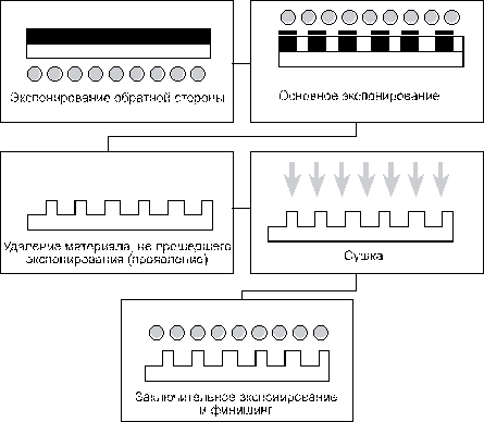 Первый этап процесса копирования – экспонирование (рис.2) обратной стороны формной пластины, которое выполняется через пленку-основу без применения вакуума /2/. Проводится УФ-излучением определенной длины волны (примерно 360 нм) для формирования основания будущих печатающих элементов, для образования активных центров, повышения светочувствительности и обеспечения правильной трапециевидной формы печатающих элементов/3/.