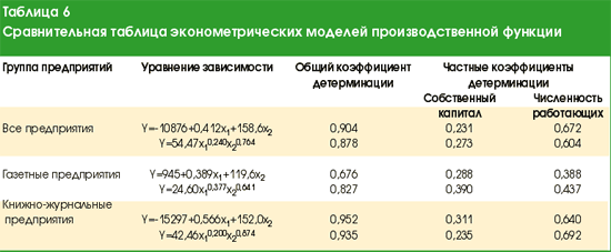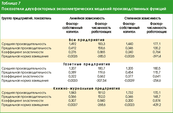 Показатели моделей для рассматриваемых групп предприятий, естественно, отличаются друг от друга. Так же естественно предположить, что значения показателей модели для группы всех предприятий, включающей в себя и газетные, и книжно-журнальные предприятия, должны находиться в диапазоне между соответствующими значениями, рассчитанными по моделям отдельно для группы газетных и для группы книжно-журнальных предприятий. Модель на основе степенной зависимости это предположение подтверждает, чего нельзя сказать о модели линейного типа. По всей вероятности, модели подобного рода более чувствительны к составу исходной информации, чем модели степенного вида: не следует забывать, что в группу всех предприятий входят помимо указанных и типографии иной специализации.