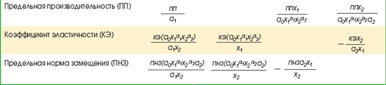 В табл. 8 представлены переводные коэффициенты, позволяющие переходить от одного показателя к другому. Хорошо видно, что показатели связаны между собой линейной или пропорциональной зависимостью, причем в большинстве случаев в расчетах участвуют факторные признаки, принимающие те или иные значения. Это означает, что величина показателей производственной функции зависит от размеров используемых ресурсов, и, следовательно, для каждого предприятия, входящего в ту или иную совокупность, значения показателей будут индивидуальными.