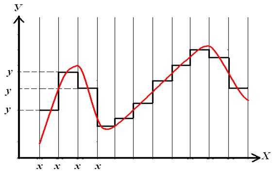 Непрерывное сообщение может быть представлено непрерывной функцией, заданной на некотором отрезке [a,b] (рис. 1.2). Непрерывное сообщение можно преобразовать в дискретное (такая процедура называется дискретизацией). Для этого из бесконечного множества значений этой функцией (параметр сигнала) выбирается их определенное число, которое приближенно может характеризовать остальные значения. Один из способов такого выбора состоит в следующем: область определения функции разбивается точками Х1, Х2 … Х на отрезке равной длинны и на каждом из этих отрезков значение функции принимается постоянным и равным, например, среднему значению на этом отрезке; полученная на этом этапе функция называется в математике ступенчатой. Следующий шаг – проецирование значений «ступеней» на ось значений функции (ось координат). Полученная таким образом последовательность значений функции Y1, Y2 … Y является дискретным представлением непрерывной функции, точность которого можно неограниченно улучшать путем уменьшения длин отрезков разбиения области значений аргумента.